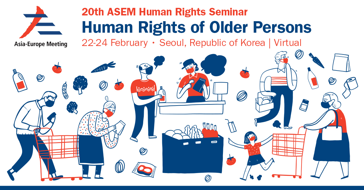 The 20th Informal ASEM Seminar on Human Rights was a hybrid/online event on the topic “Human Rights of Older Persons”. Taking place on 22-24 February 2021, the Seminar aimed to contribute towards the promotion of human rights of older persons and provided a platform for discussion on how to further strengthen the autonomy, social protection and participation of older persons at the ASEM partner countries.