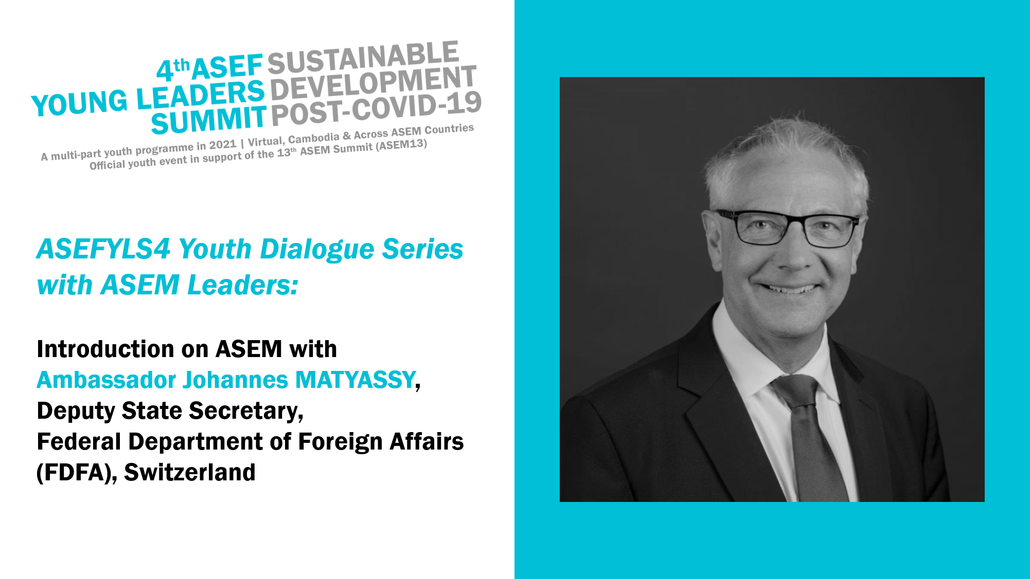 At the beginning, of the Youth Dialogue Series, ASEF wishes to start with a general session on the ASEFYLS4 topic “Sustainable Development in a post-COVID19 world – How can ASEM as a multilateral forum contribute?”. This session will set the framework and allow for a critical reflection on the need for more effective multilateral systems, including ASEM. Ambassador Johannes MATYASSY, Deputy State Secretary in the Federal Department of Foreign Affairs (FDFA), Switzerland, will also discuss with the ASEFYLS4 participants the role of youth in the multilateral initiatives and political decision making process.