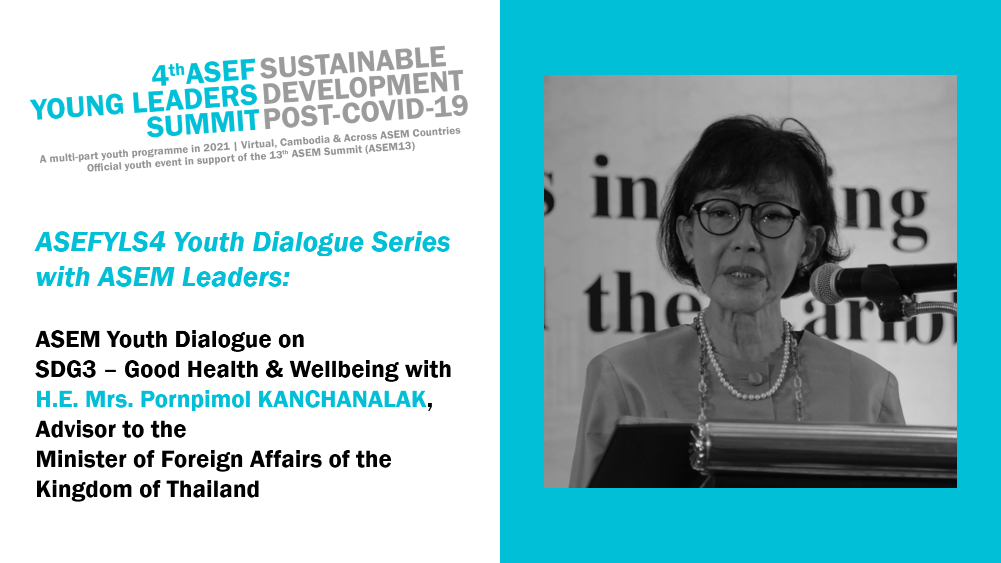 This session with H.E. Mrs Pornpimol KANCHANALAK, Advisor to the Minister for Foreign Affairs of the Kingdom of Thailand will explore the ASEFYLS4 topic of ‘Sustainable Development in a Post-COVID-19 World’ with a particular focus on SDG3 – Good Health and Wellbeing.
