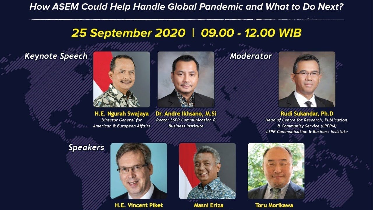 The Ministry of Foreign Affairs of the Republic of Indonesia, in cooperation with the LSPR Communication & Business Institute in Jakarta are organising a webinar session titled “COVID-19 Post-Action Plan: How ASEM Could Help Handle Global Pandemic and What to Do After?